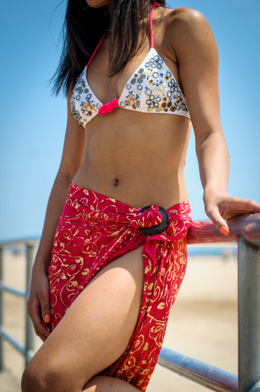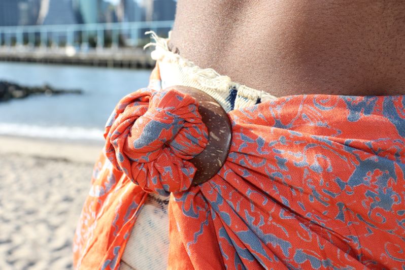 Directions: Pull the parts of the sarong through the holes of the CoCo Shell that you would tie together. You can leave it like that or you can continue to tie/style it how you see fit.