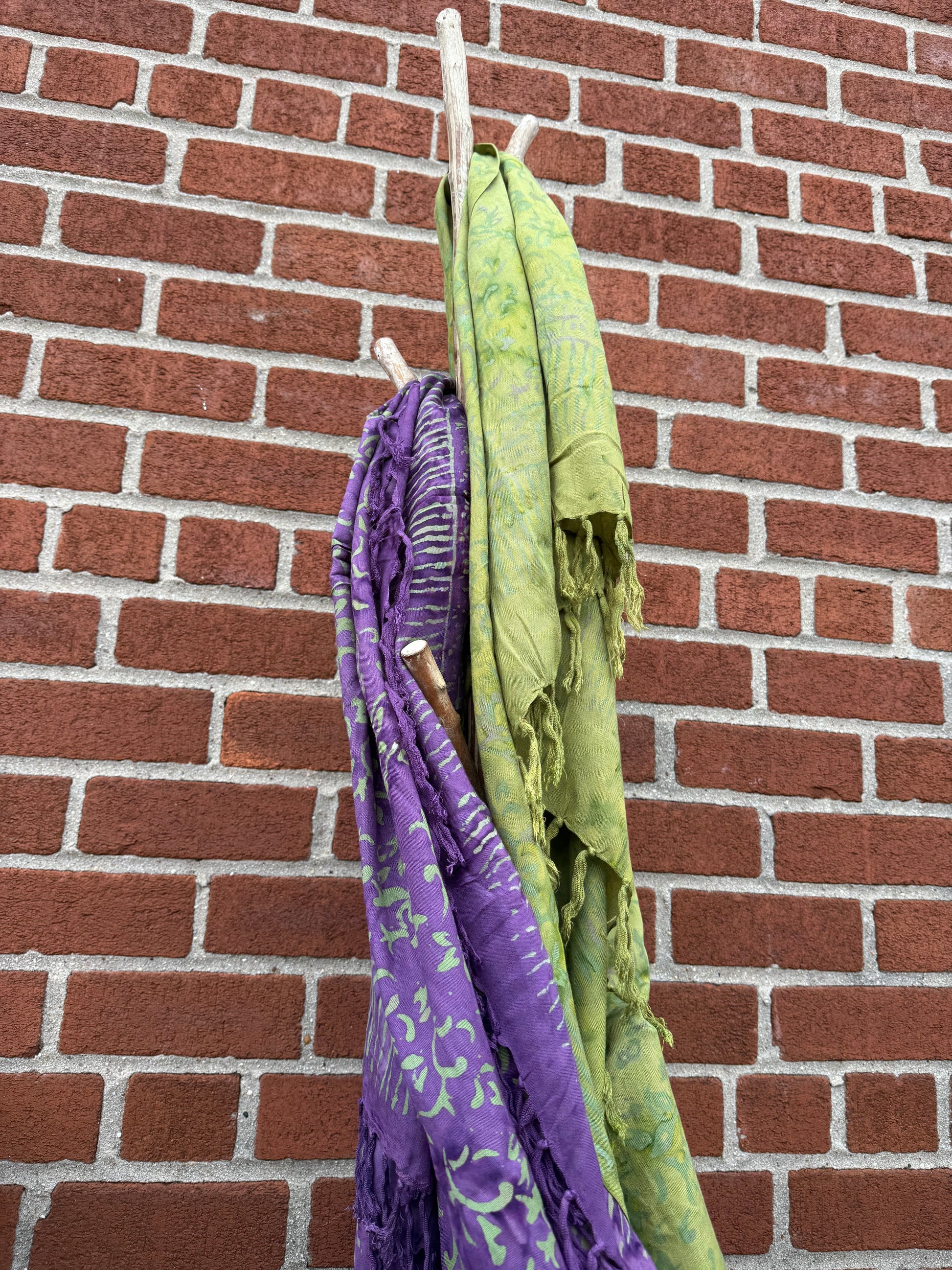 The Guava Sarong brings tropical vibrance to life with its blend of green, purple, and red hues—fresh, bold, and full of island charm.
